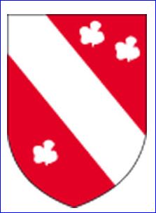 De gueules à la bande d'argent, accompagnée de trois trèfles du même, deux en chef rangés en bande et un en pointe.