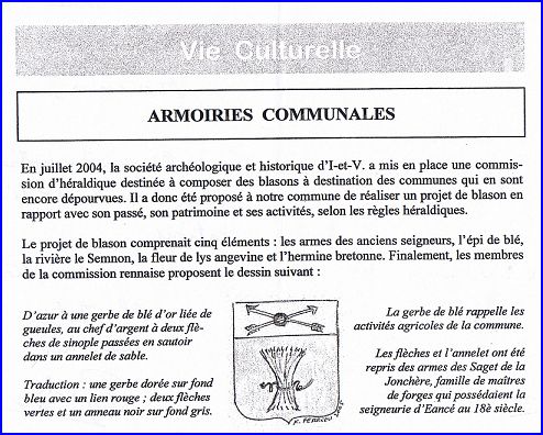 D'azur à gerbe de blé d'or, liée de gueules; au chef d'argent chargé de deux flèches de sinople passées en sautoir et traversant un annelet de sable en coeur.