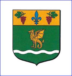 (2016) De sinople au dragon d'or soutenu d'une trangle ondée d'argent; au chef d'or chargé d'une fleur de lis d'azur accostée de deux grappes de raisin de gueules pamprées de sinople.