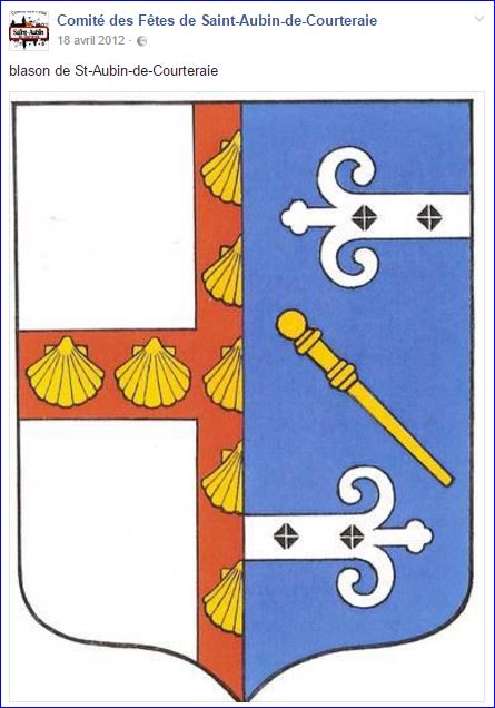 (2011) Parti: au 1er mi-parti d'argent à la croix de gueules chargée de neuf coquilles d'or, au 2e d'azur au bourdon d'or posé en bande accompagné de deux vertenelles fleuronnées la pointe tréflée d'argent, cloutées de sable, l'une en chef mouvant du flanc senestre, l'autre en pointe mouvant de la partition.