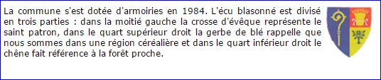 (1984) Parti: au 1er d'azur à la crosse d'or, au 2e coupé au I de gueules à la gerbe de blé d'or, liée d'argent et au II d'or au chêne de sinople, englanté de sable.