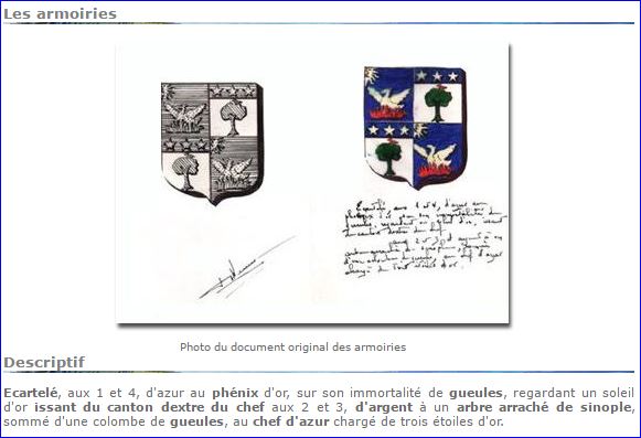 (1987) Écartelé: aux 1er et 4e d'azur au phénix d'or sur son immortalité de gueules, regardant un soleil levant d'or, aux 2e et 3e d'argent à l'arbre arraché de sinople, sommé d'un oiseau de gueules et au chef d'azur chargé de trois étoiles d'or.