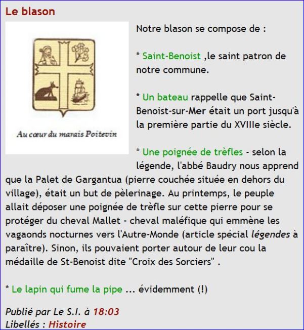 D'azur à la croix latine alésée d'or, enhendée de trois pointes et perronnée d'un degré, cantonnée au 1er d'un buste de saint Benoît issant, au 2e d'un bouquet de quatre trèfles, au 3e d'un lapin assis et contourné, fumant la pipe, au 4e d'un vaisseau contourné, le tout d'or.