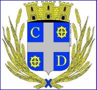(1999) D'azur à la croix d'argent cantonnée au 1er de la lettre capitale C, aux 2e et 3e d'une roue de moulin et au 4e de la lettre capitale D, le tout d'or.