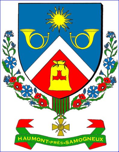 (2016) De gueules au sac à céréales d'or chargé d'une coquerelle de gueules; mantelé d'azur chargé de deux grêliers d'or adossés et accompagnés en chef d'un soleil non figuré d'or; au chevronnel d'argent brochant sur la partition.