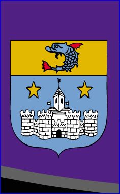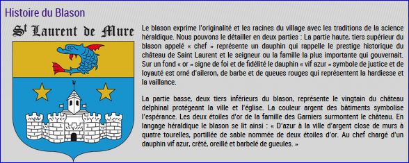 D'azur à l'église entourée d'une enceinte de quatre tours d'argent, ouverte et maçonnée de sable, surmontée de deux étoiles d'or; au chef du même chargé d'un dauphin d'azur, barbé, crêté, lorré, oreillé et peautré de gueules.