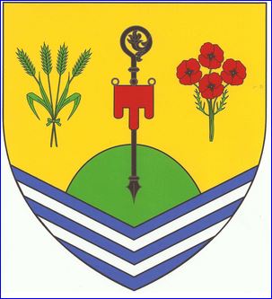 D'or au coupeau de sinople, à la crosse contournée de sable brochante et adextrée de quatre épis de blé, tigés et feuillés de sinople, empoignés et liés du même, senestrée un bouquet de quatre coquelicots de gueules, boutonnés de sable, les fleurs posées 1, 2 et 1, tigées et feuillées de sinople, au gonfanon à trois pendants de gueules, frangé de sinople brochant sur la crosse au point d'Honneur; à la champagne en chevron renversé d'azur chargée de deux chevronnels renversés d'argent.