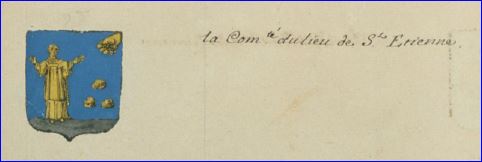D'azur à saint Étienne vêtu en diacre à dextre, contourné et de profil, d'or sur une terrasse cousue de gueules (de sable), à la main d'or mouvant du flanc senestre en chef, la paume vers le bas lâchant trois cailloux du même, ordonnés 2 et 1.