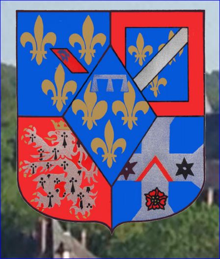 Écartelé: au 1er d'azur à trois fleurs de lis d'or, au bâton de gueules péri en bande et chargé en chef d'un dauphin d'azur, au 2e d'azur à trois fleurs de lis d'or, à la barre d'argent brochante et à la bordure cousue de gueules, au 3e de gueules au lion d'hermine couronné, armé et lampassé d'or, au 4e d'azur à la croix d'argent, les extrémités pattées, chargée en coeur d'un chevron de gueules, sur chaque traverse d'une molette de sable et en pointe d'une rose de gueules boutonnée d'argent; sur le tout, un écusson en losange d'azur à trois fleurs de lis d'or et au lambel d'argent.