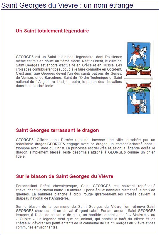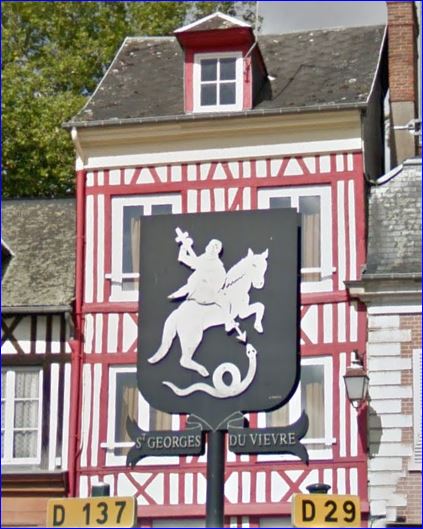 (1993) D'azur à saint Georges de carnation en cotte de fer, surcot et cape de gueules, chevauchant un destrier cabré d'argent et terrassant d'une croix latine à longue hampe ferrée de sable une vivre du même dressée, le tout contourné, posé sur une motte d'or mouvant de la pointe et brochant à la fois sur le champ et un marécage de sinople.