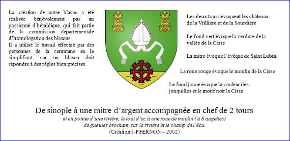 (2002) De sinople à la mitre d'argent accompagnée en chef de deux tours et en pointe d'une rivière, le tout d'or, à la roue de moulin de huit auges de gueules brochant sur la rivière et le champ.