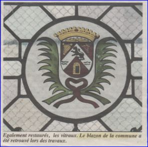 De gueules au chevron d'argent chargé d'un lion de sable et de deux burelles ondées d'azur, accompagné en chef, à dextre, d'une harpe d'or, à senestre d'une grappe de raisin de pourpre, tigée d'or et feuillée de sinople et, en pointe, du portail de l'église du lieu d'or.