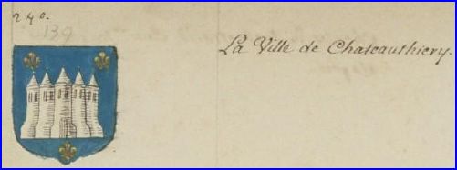 (1780) D'azur au château composé de cinq tours couvertes d'argent et girouettées d'or, accompagné de trois fleurs de lis du même.
