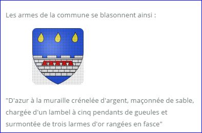 (1999) D'azur à la muraille crénelée d'argent, maçonnée de sable, chargée d'un lambel à cinq pendants de gueules et surmontée de trois larmes d'or rangées en fasce.