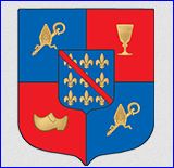 (2018) Écartelé: aux 1er et 4e d'azur à la mitre d'or brochant sur une crosse posée en barre du même, au 2e de gueules au verre à pied d'or, au 3e de gueules au sabot d'or; sur le tout, d'azur à neuf fleurs de lis d'or, 3, 3 et 3, et à la cotice de gueules brochant.