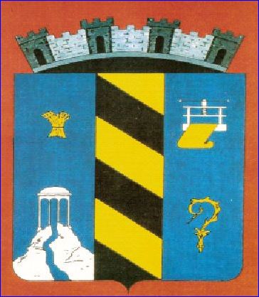 (1954) D'azur au pal bandé d'or et de sable, accompagné en chef à dextre d'une gerbe de blé d'or et à senestre d'une presse à papier d'argent d'où sort un rouleau de papier d'or, en pointe à dextre d'une fontaine sur un mont d'argent mouvant de la pointe et d'où coule une source du champ et à senestre d'une tête de crosse d'or.