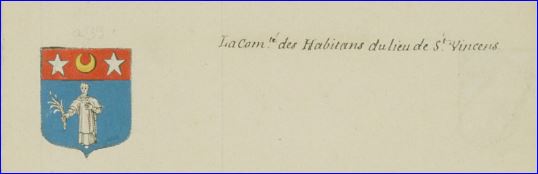 D'azur à saint Vincent d'argent tenant une palme du même dans sa dextre; au chef cousu de gueules chargé d'un croissant d'or, accosté de deux étoiles aussi d'argent.