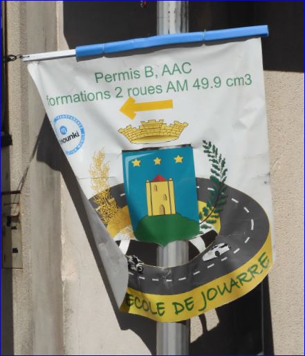 (1921, 2012) D'azur à la tour romane de l'abbaye du lieu d'or, essorée de gueules, ouverte et ajourée de sable, flanquée de deux tours couvertes d'or, le tout posé sur un mont de sinople et accompagné de trois étoiles d'or rangées en chef.