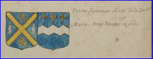 (1) D'azur au sautoir dentelé d'or accompagné en chef et en pointe d'un lion d'argent et sur chaque flanc d'un poupart [enfant emmailloté] du même posé de front.