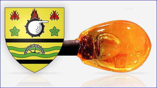(1962) Coupé: au 1er d'or à la cornue d'argent brochant sur une roue dentée de sable enflammée de gueules, accompagnées en chef de deux abeilles en vol du même et en flancs de deux quintefeuilles de sinople, au 2e d'or à la roue de moulin de sable mouvant d'une jumelle ondée de sinople et soutenues d'une burelle de sable; à la burelle du même brochant sur la partition.