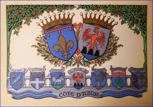 (ap. 1905) D'azur à l'olivier d'argent terrassé d'or, accompagné d'une étoile d'or au canton dextre du chef et d'un soleil couchant du même.