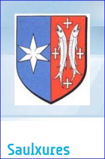 Parti d'azur à l'étoile de six rais d'argent et de gueules à deux saumons adossés d'argent accompagnés de quatre croisettes recroisetées d'argent.