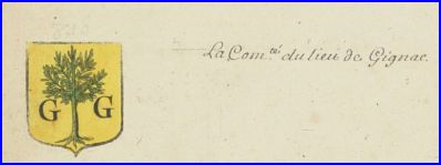D'or à l'olivier de sinople fûté d'argent accosté de deux lettres capitales G de sable.