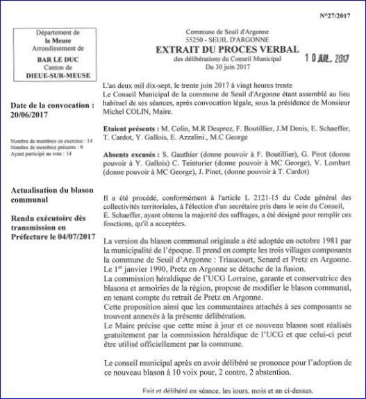Le conseil municipal a adopté, le 30 juin 2017, un écu qui actualise [nouvelle version] celui que Mr MEYER avait créé en 1981, pour les trois villages de Triaucourt, Senard et Pretz en Argonne. A l'époque le CM l'avait adopté mais il n'était plus utilisé par la commune de Seuil d'Argonne car obsolète depuis 1990 avec la reprise d'autonomie de la commune de Pretz en Argonne [symbolisée par l'épée].