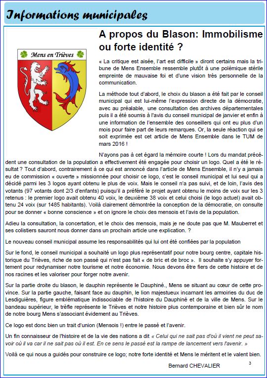 Bulletin municipal Le Trait d'Union Mensois No 179, avril 2016, page 3.