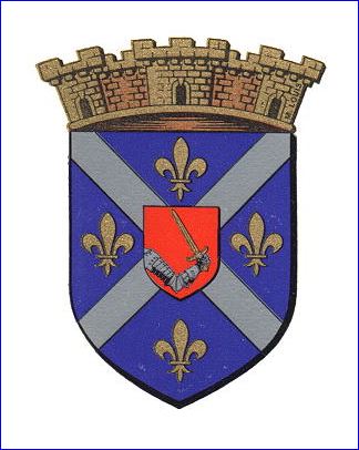 D'azur au sautoir d'argent cantonné de quatre fleurs de lis d'or; sur le tout, de gueules au dextrochère armé contourné d'argent tenant une épée d'or.