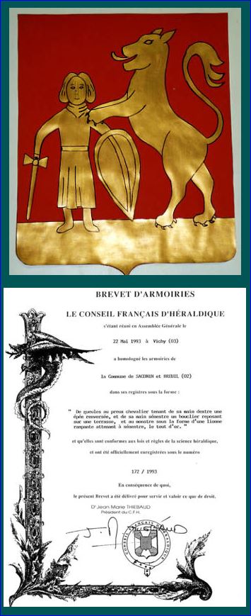 (1993) De gueules au preux chevalier tenant de sa main dextre une épée basse et de sa main senestre un bouclier, affrontant un monstre sous la forme d'une lionne rampante attenant à senestre, le tout d'or, sur une terrasse du même.