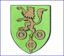 De sinople au lion d'or soutenu de trois annelets ordonnés 2 et 1, les deux premiers enfermant un besant et celui de la pointe combiné avec un bâton posé en pal, le tout du même.