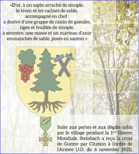 D'or au sapin de sinople, fûté et arraché de sable, accompagné en chef à dextre d'une grappe de raisin de gueules feuillée de sinople et à senestre d'une masse et d'un marteau d'azur emmanchés de sable passés en sautoir.