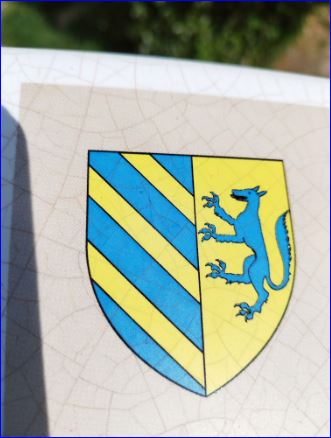 (1983) Parti: au 1er d'azur à trois bandes d'or, au 2e d'or au loup ravissant d'azur.
