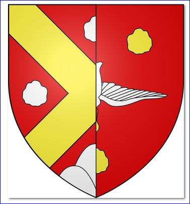 Mi-parti: au 1er de gueules au sautoir d'or accompagné de trois cailloux d'argent et en pointe d'un mont à trois coupeaux du même; au 2e de gueules à la colombe du saint Esprit d'argent tenant dans son bec la sainte Ampoule d'or, accompagnée de trois cailloux d'argent.