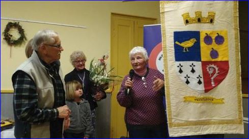 (2016) Écartelé: au 1er d'azur à la grive contournée d'or, au 2e d'or à trois prunes au naturel, au 3e d'hermine plain, au 4e de gueules au crosseron d'argent.