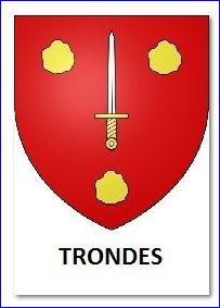 De gueules à l'épée haute d'argent garnie d'or accompagnée de trois cailloux d'argent.