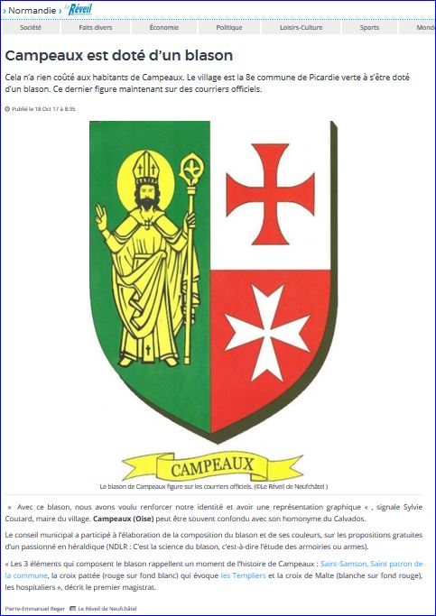 (2017) Parti : Au 1er de sinople à saint Samson, évêque d'or, au 2e coupé au I d'argent à la croix pattée et alésée de gueules, au II de gueules à la croix de Malte d'argent.