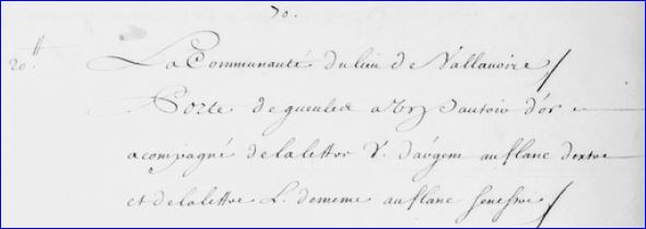 De gueules au sautoir d'or accompagné des lettres capitales d'argent V à dextre et L à senestre.