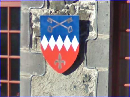 Coupé: au 1er d'azur à deux clefs d'or passées en sautoir, au 2e de gueules à la fleur de lis d'or, à cinq fusées d'argent accolées en fasce et brochant sur la partition