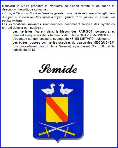 (2005) D'azur à l'écusson d'or chargé d'une bande de gueules, surmonté de deux merlettes affrontées d'argent et soutenu de deux épées hautes d'argent, garnies d'or et passées en sautoir.
