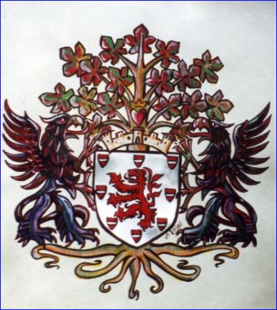 D'argent au lion de gueules accompagné de huit écussons de gueules à la fasce d'argent ordonnés en orle.