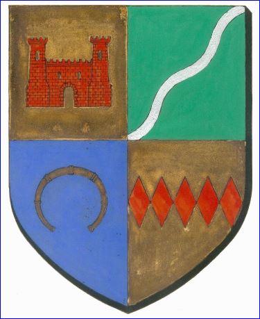 (1967) Écartelé: au 1er d'or au château de gueules, maçonné de sable, ouvert et ajouré du champ, au 2e de sinople à la cotice en barre ondée d'argent, au 3e d'azur à la torque versée d'or, au 4e d'or à la fasce fuselée de cinq pièces de gueules.