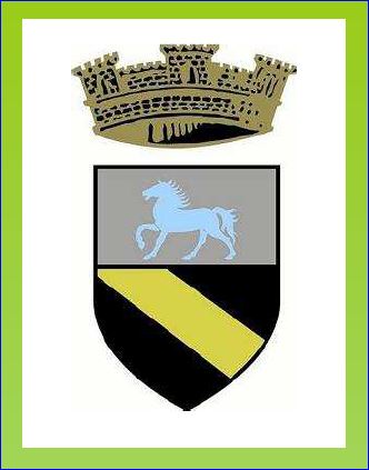 Coupé: au 1er d'argent au cheval gai passant d'azur, au 2e de sable à la bande d'or.