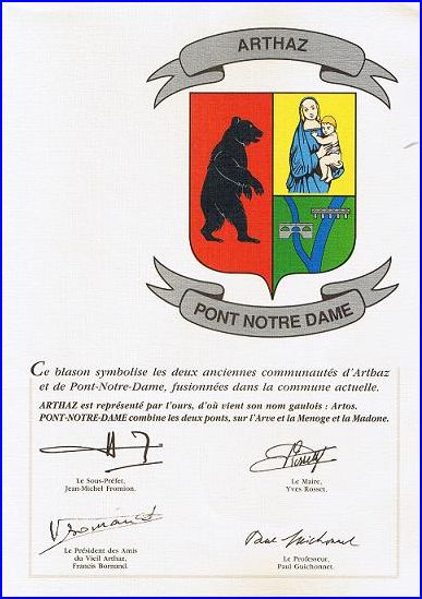 (1990) Parti: au 1er de gueules à l'ours rampant contourné de sable, au 2e coupé au I d'or à Notre Dame à l'Enfant de carnation, vêtue d'azur issant du trait de partition et au II de sinople à deux rivières cousues d'azur mouvant du chef, l'une à dextre enjambée d'un pont d'une arche d'argent; l'autre a senestre enjambée d'un pont de cinq arches du même, et se rejoignant en pointe.