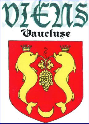 De gueules à deux dauphins affrontés et couronnés, tenant de leur gueules une grappe de raisin suspendue et accompagnés en pointe d'un croissant, le tout d'or.