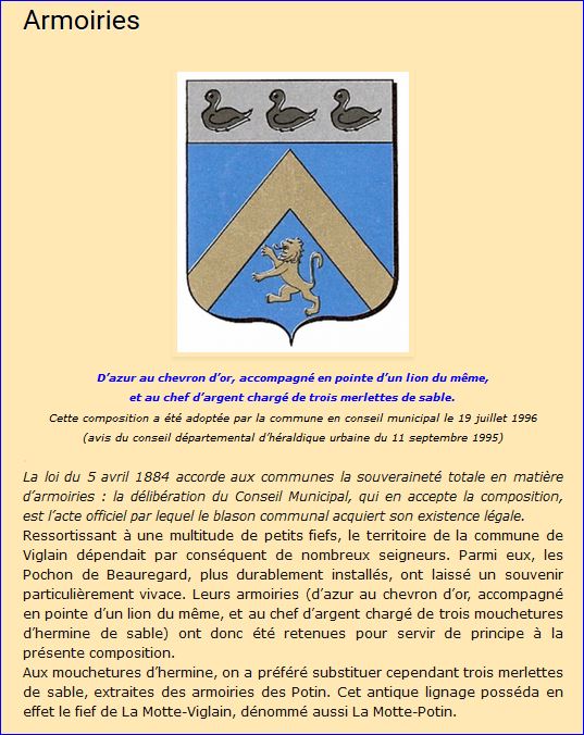 (1996) D'azur au chevron d'or soutenu d'un lion du même; au chef d'argent chargé de trois merlettes de sable.