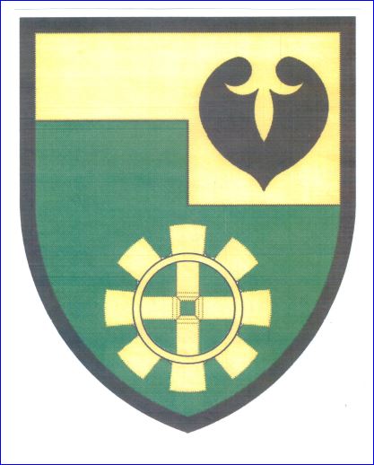 Mi-coupé, parti, coupé: au 1er d'or à la bouterolle de sable à senestre, au 2e de sinople à la roue de moulin d'or.