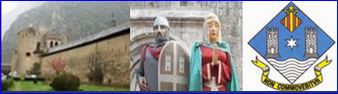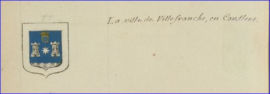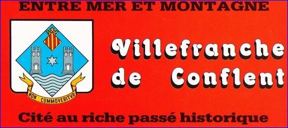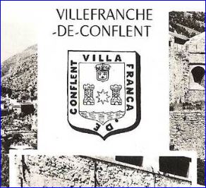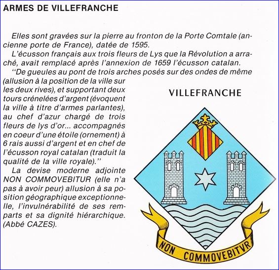 Écu en losange: D'azur à l'étoile de six rais d'argent, accostée de deux tours du même, surmontée d'un écusson (d'azur chargé de trois fleurs de lis d'or, l'écusson bordé du même et) en losange d'or à quatre pals de gueules timbré d'une couronne (royale fermée) d'or, aux ondes d'argent mouvant de la pointe (; le tout enfermé dans une bordure d'argent (chargée de l'inscription « Villa Franca de Conflent » en lettres capitales de gueules)).