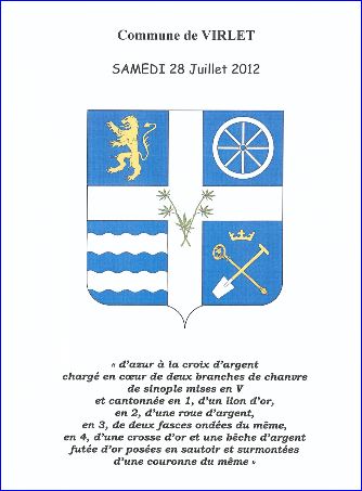 D'azur à la croix d'argent chargée en coeur de deux branches de chanvre de sinople posées en chevron renversé, cantonnée au 1er d'un lion d'or, au 2e d'une roue d'argent, au 3e de deux fasces ondées d'argent et au 4e d'une crosse d'or passée en sautoir avec une bêche d'argent, emmanchée d'or, le fer en bas et surmontées d'une couronne du même.